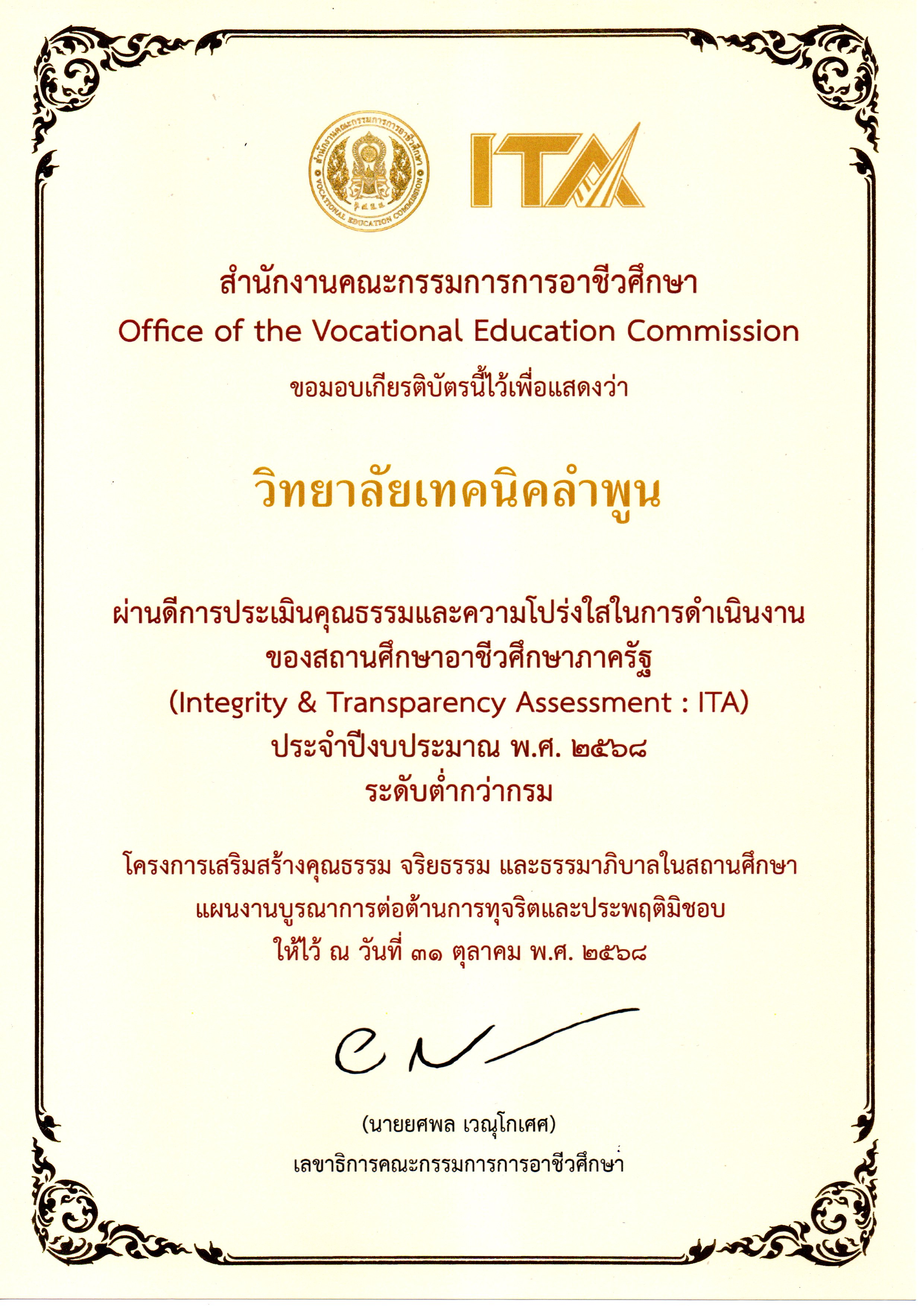 วิทยาลัยเทคนิคลำพูน ผ่านดีการประเมินคุณธรรมและความโปร่งใสในการดำเนินงาน ของสถานศึกษาอาชีวศึกษาภาครัฐ ประจำปีงบประมาณ 2568 ระดับต่ำกว่ากรม