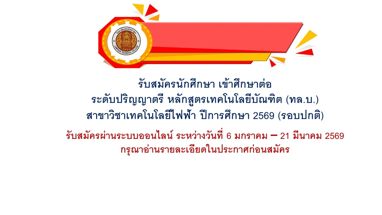 รับสมัครนักศึกษาปริญาตรี สาขาเทคโนโลยีไฟฟ้า ประจำปีการศึกษา 2569